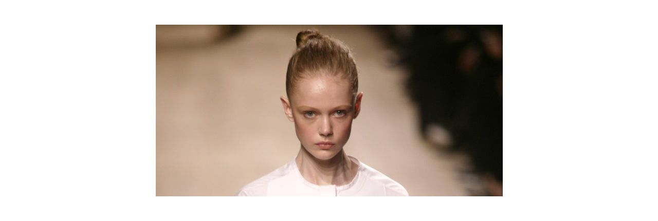 Прическа пучок. По примеру моделей модного показа от Celine (на фото выше), предлагаем вам не тратить драгоценное время и не искать слишком сложную прическу. Иногда достаточно простой прически пучок. Эту прическу может сделать каждая девушка, у которой минимальная длина волос превышает длину стрижки-боб. Примечательно, что такая прическа может держать форму в течение всего дня, не требуя дополнительного внимания. Для создания пучка соберите весь объем волос назад и зафиксируйте их в хвост. Вы можете самостоятельно выбрать высоту центра пучка. Как только ваш хвост готов, с помощью второй резинки зафиксируйте волосы в пучок. Разбрызгайте лак на полученную прическу, чтобы результат оставался неизменным в течение целого дня.