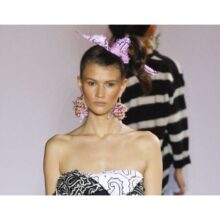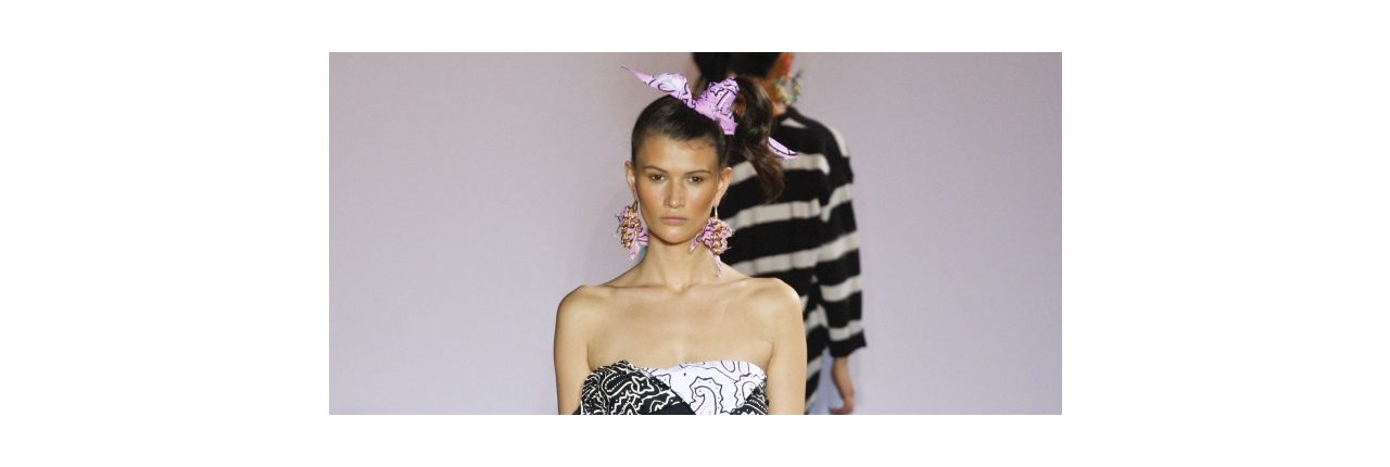 Бандана-резинка. Бандана, выполняющая функцию резинки, представлена во время модного дефиле House of Holland (на фото выше). Эффект «обратно в 90-е» гарантирован, если вы сделаете прическу пальмочка. Вы также можете выбрать косу или же низкий хвост. Для создания модного эффекта сделайте выбранную прическу и зафиксируйте волосы обычной резинкой. После того, как прическа готова, используйте бандану, завязав ее поверх резинки.